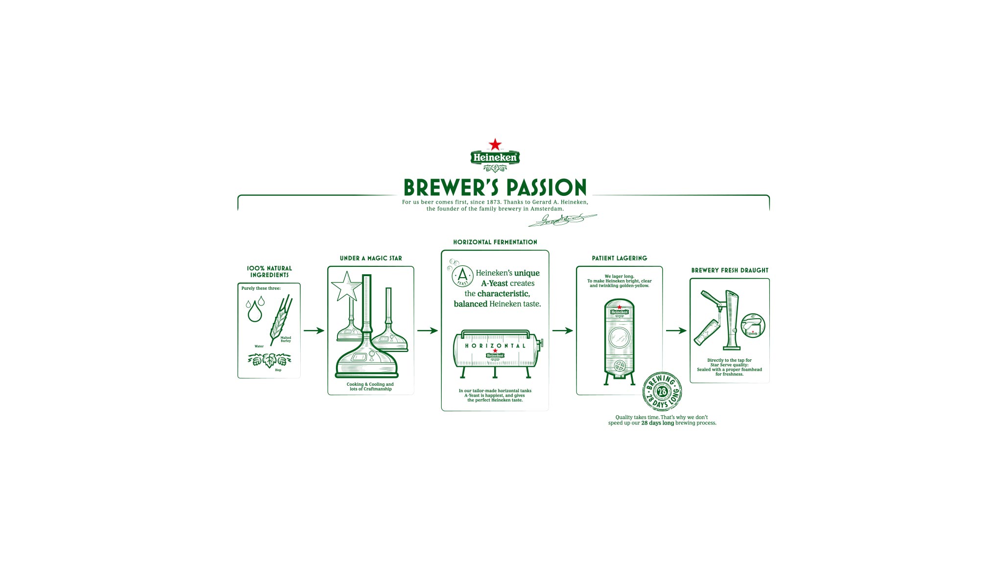 Tardamos 28 días en preparar Heineken. Para obterner un sabor perfectamente equilibrado, una claridad refrescante y un hermoso color amarillo-dorado. La calidad lleva tiempo, y lo vale.